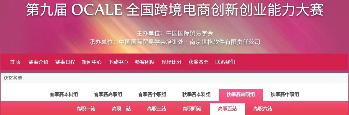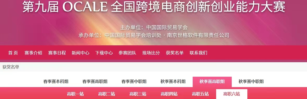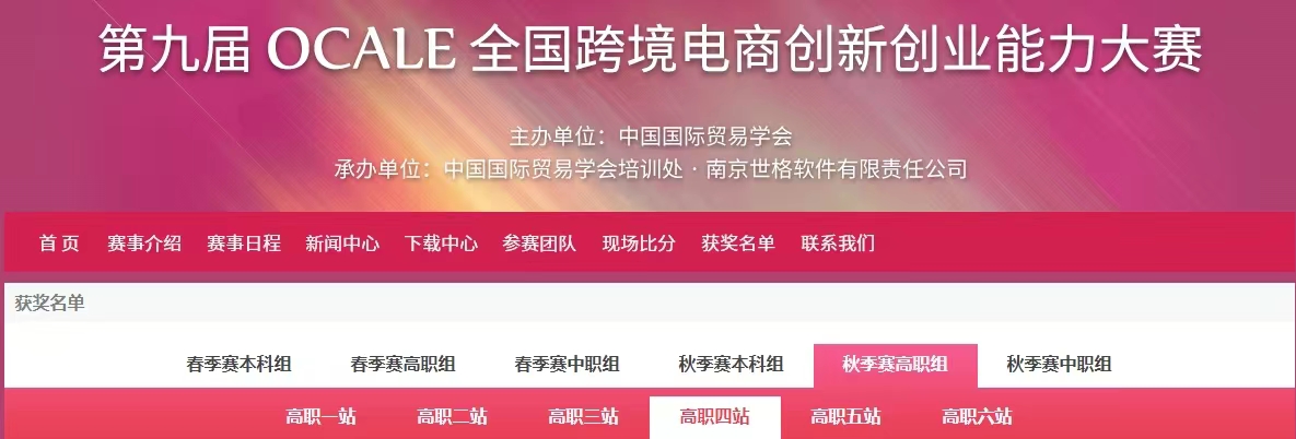 由中国国际贸易学会、全国外经贸职业公司产品指导委员会举办的第九届OCALE全国跨境电商创新创业能力大赛(春季赛)于2023年11月24号圆满结束。DB视讯经济管理系在全国504所院校的2486支参赛队中脱颖而出,斩获高职组赛站团体一等奖3项。