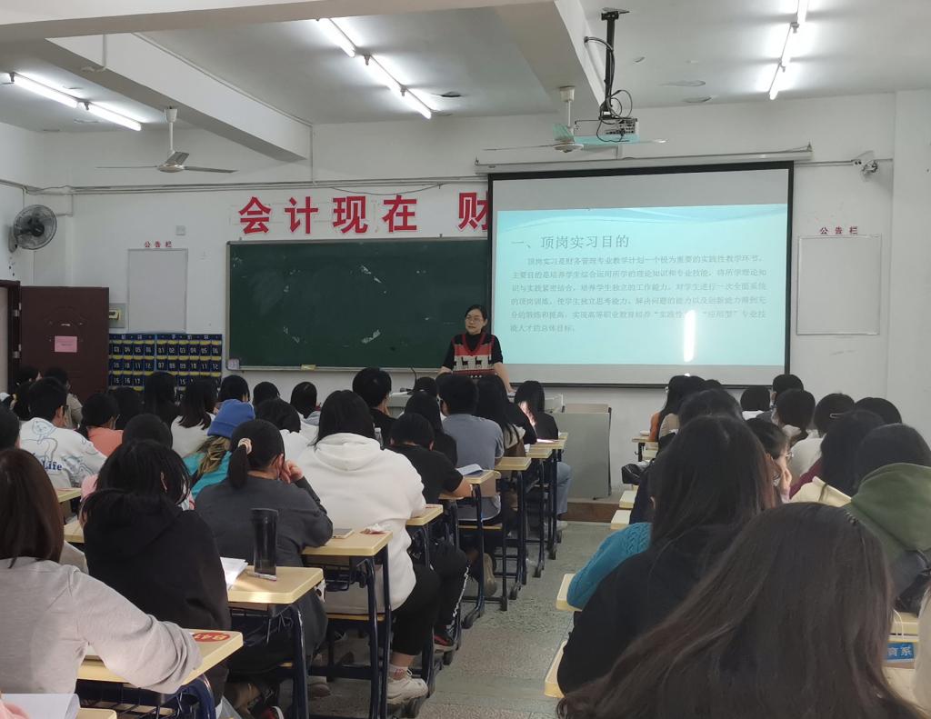 会上,财务管理专业带头人林惠玲从实习的目的、实习的规划等方面对顶岗实习工作的开展做了总体的部署,她希望大家通过实习巩固理论知识,提高专业应用能力。