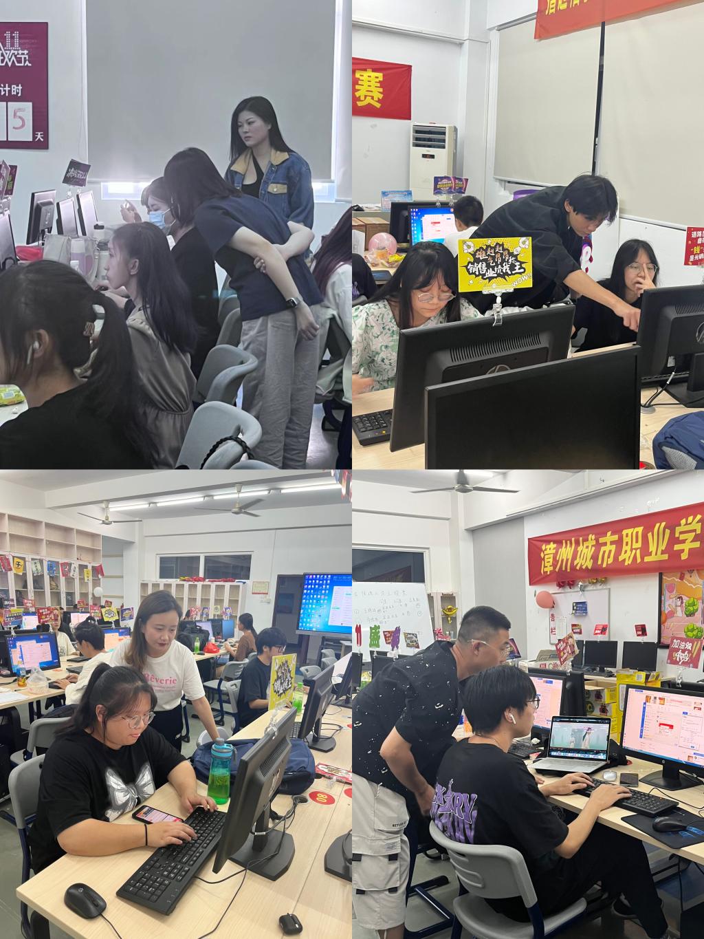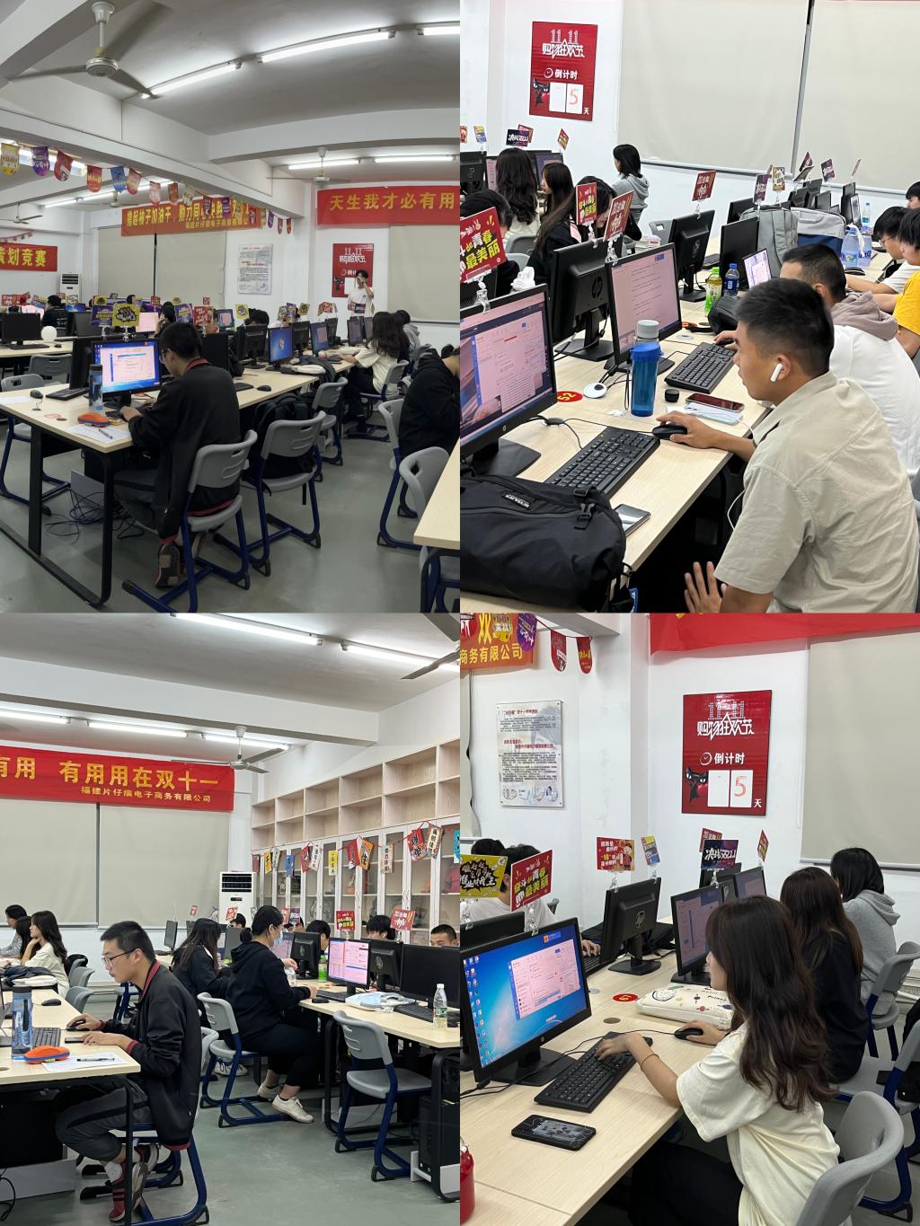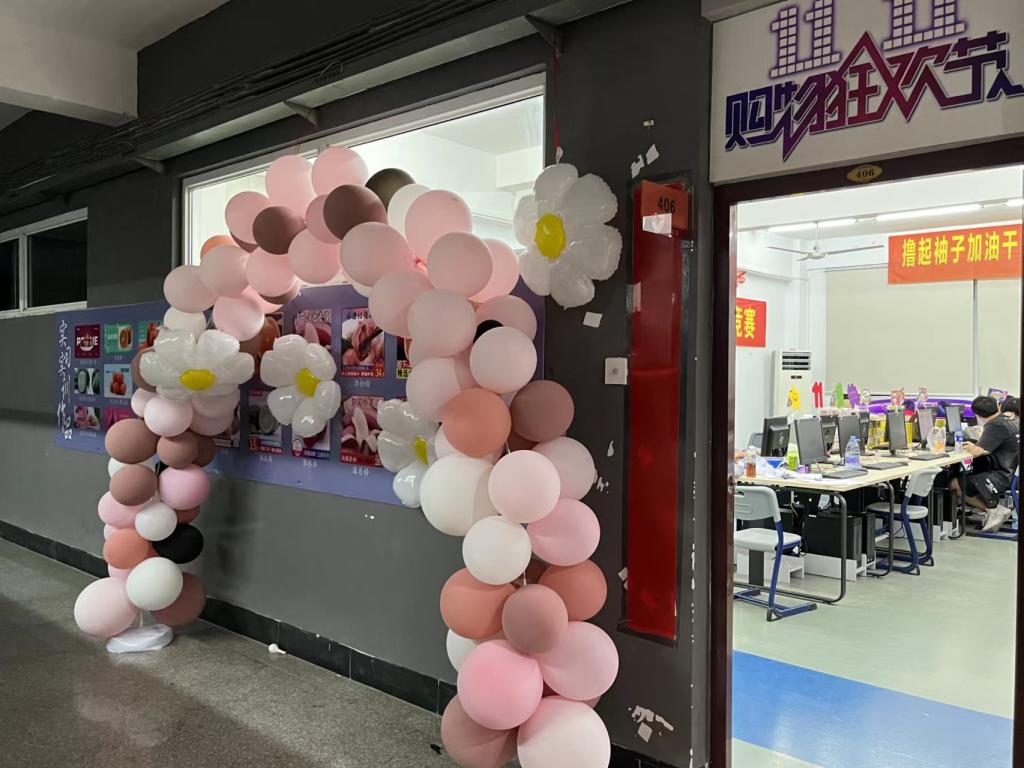 为了给大家营造出一个良好的环境和积极工作氛围,我们在课后组织了同学们对实训室进行了精心的布置和设计。在实训室门口也布满着绚丽多彩的气球和生动形象的天猫标志。我们的同学集思广益写出了迎战双十一的标语,并做成两条横幅标语挂在实训室内,同时也做了双十一倒计时的海报贴在墙上,作为一种激励。同学们看到自己的业绩不断地提升,工作中的疲劳早已被兴奋和喜悦代替。
