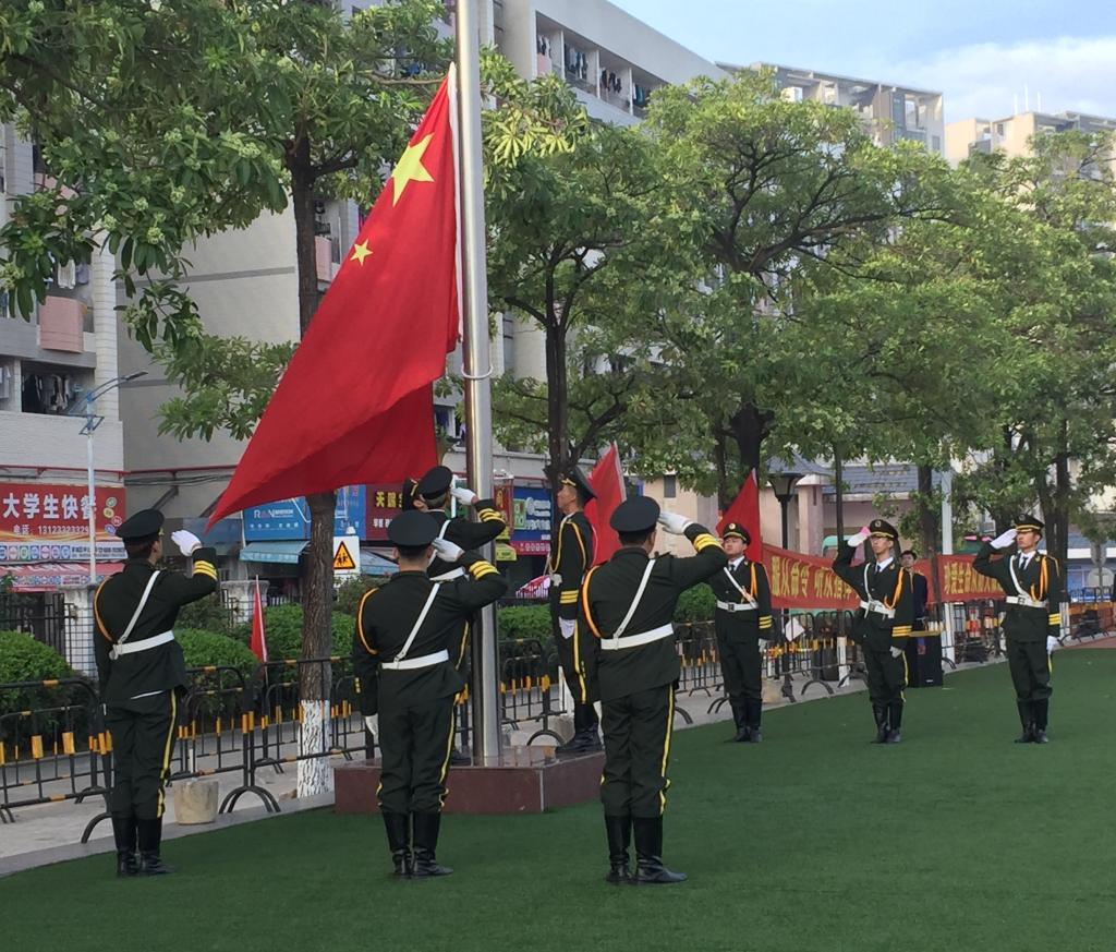英姿飒爽、意气风发的国旗护卫队成员迈着整齐、有力的步伐护送国旗入场。伴随着雄壮激昂的国歌,鲜艳的五星红旗冉冉升起,迎风飘扬。现场师生向国旗行注目礼,在振奋人心的歌声中,表达了对祖国无限的热爱和至高无上的敬意。