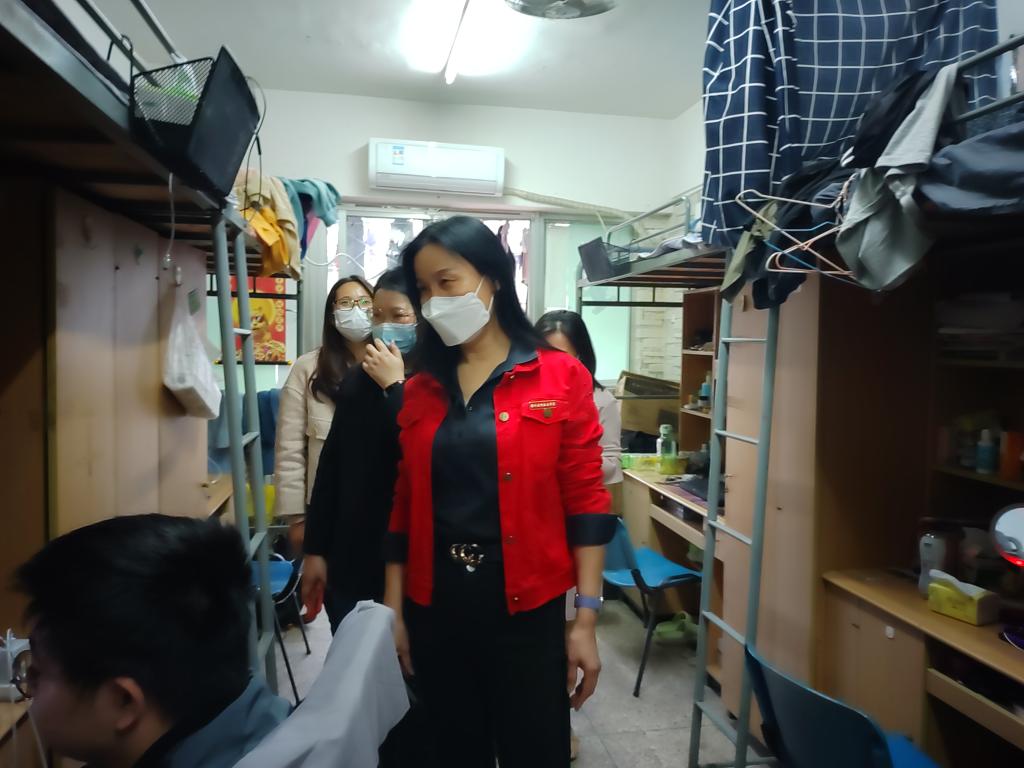 为做好公司封闭期间的员工宿舍管理工作,了解员工的急难愁盼问题,3月27日下午,经济管理系党总支书记林红、系副主任周晓红、分管员工工作的洪菁老师带领全系辅导员深入防控一线,走进员工宿舍,对系的疫情防控工作进行走访与指导。