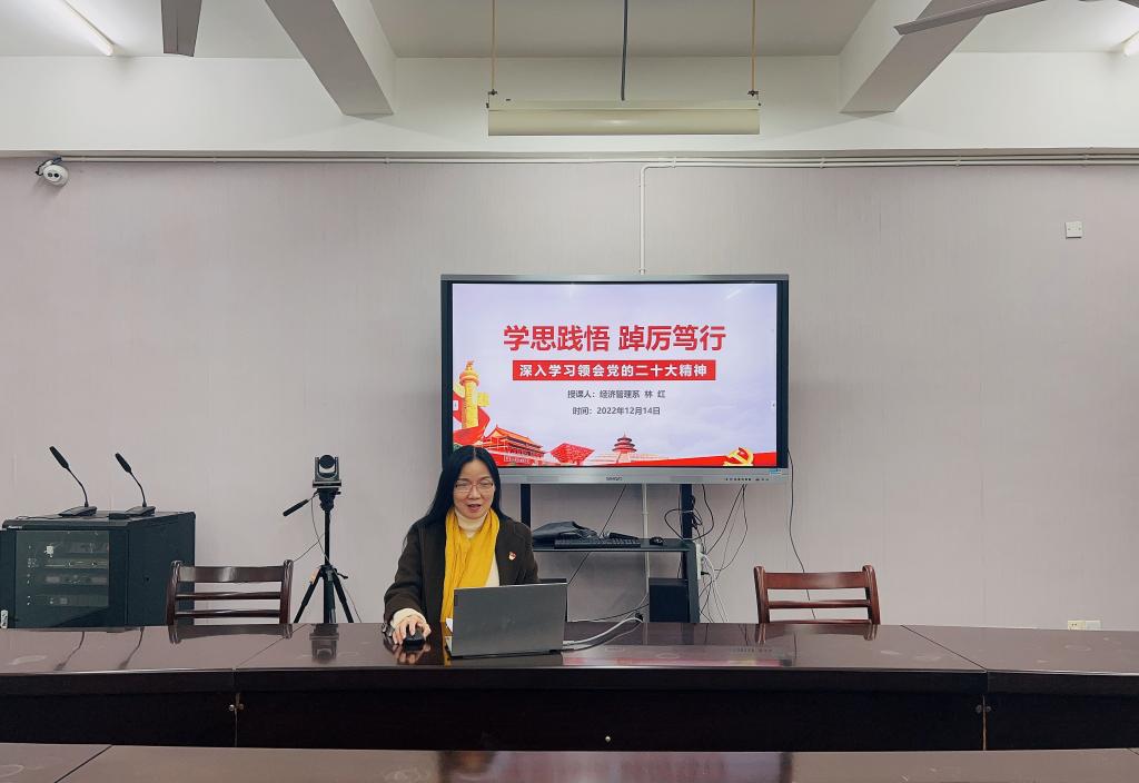 2022年12月14日下午,经济管理系党总支书记林红为系全体专业带头人、辅导员和行政人员讲授题为“学思践悟 踔厉笃行”的党课,宣讲二十大精神,并在课后与参会人员座谈。