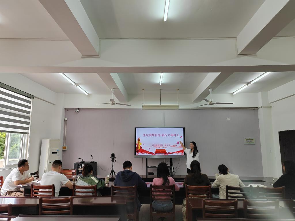 2023年11月13日,经济管理系第二党支部书记柯桂芳在系会议室作题为《坚定理想信念  践行立德树人》的专题党课,扎实推进学习习近平新时代中国特色社会主义思想主题教育,支部全体党员参加学习。